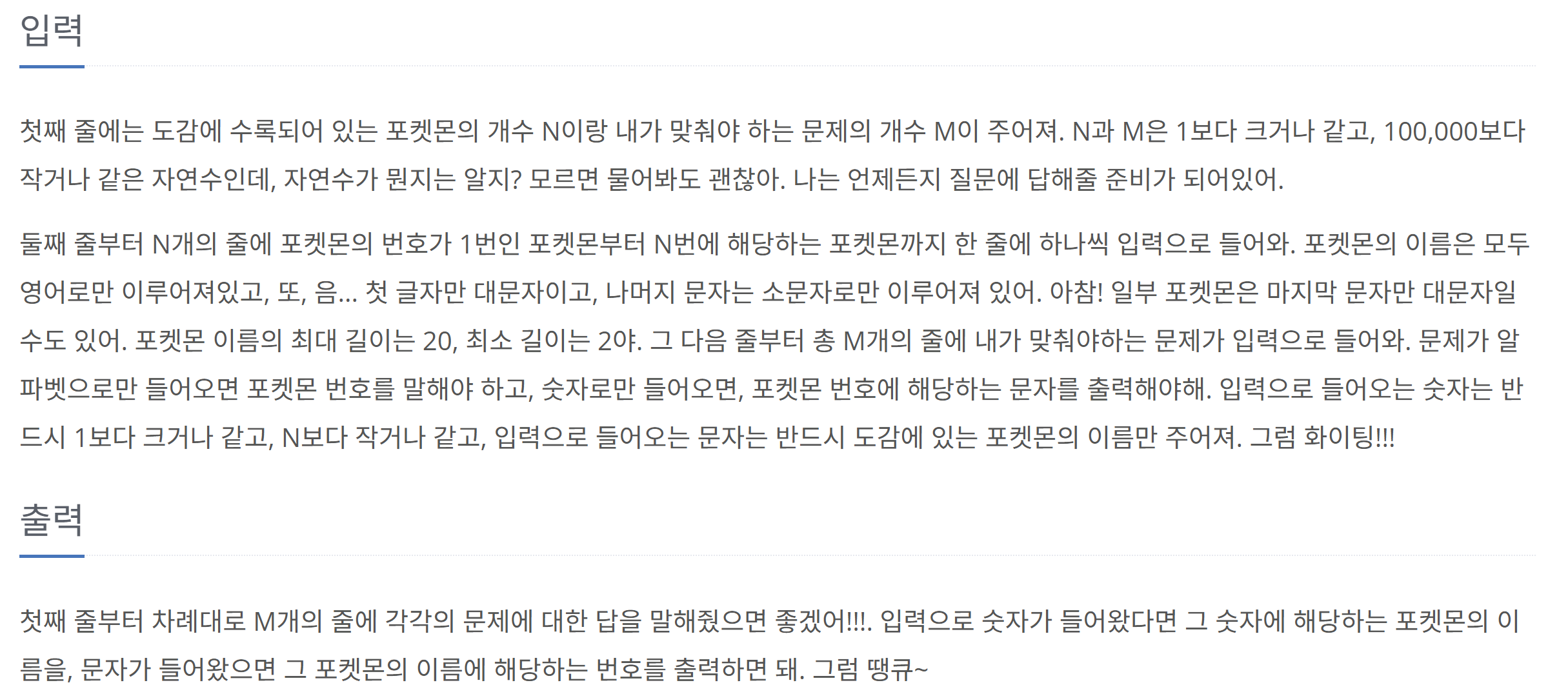 입력받는 포켓몬 개수 N, 맞춰야하는 문제 M 이 주어집니다.