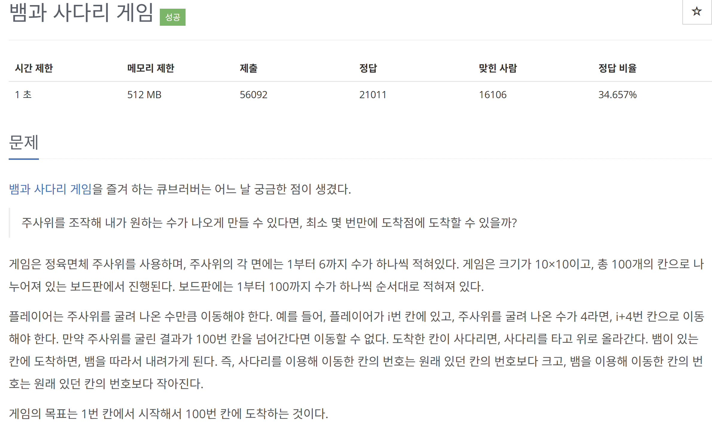 제 코드에서는 뱀, 사다리를 분리해서 배열, map에 저장하고 처리 했는데 분리안하고 같이 처리해도 될것으로 보인다.